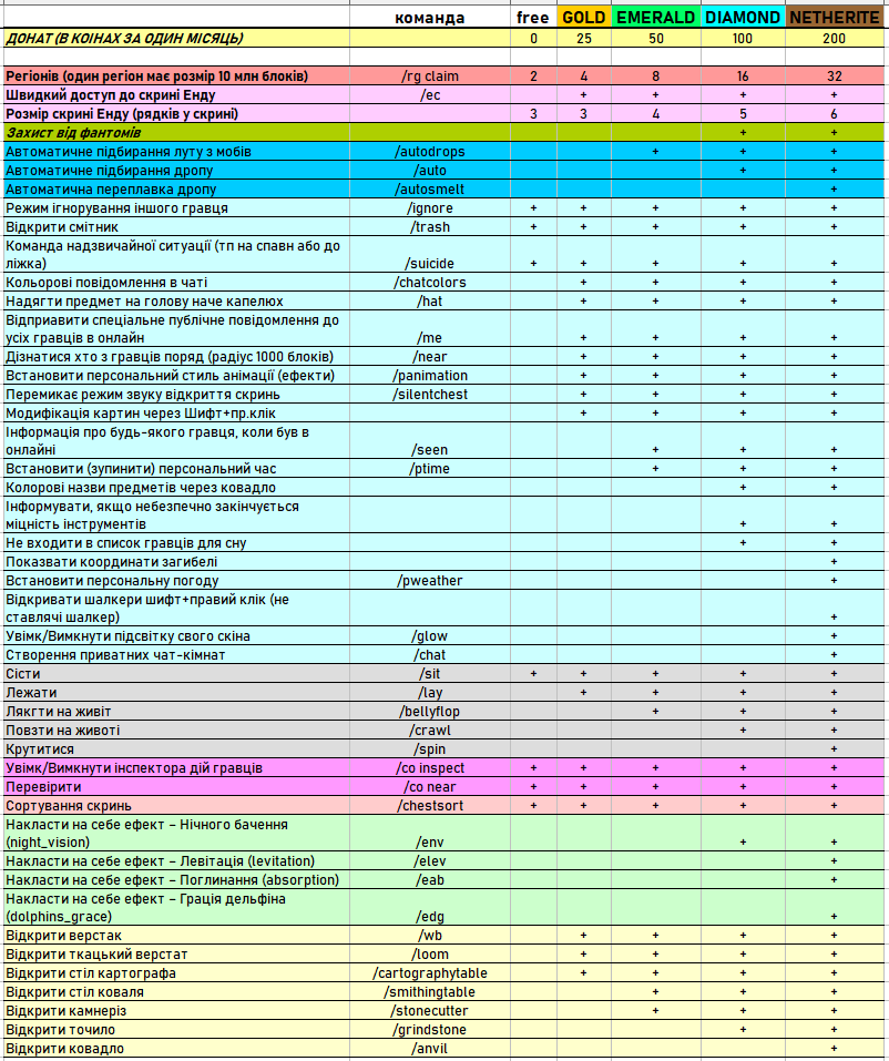За донат для підтримки сервера можна отримати статуси які надають покращення для життя гравця.
