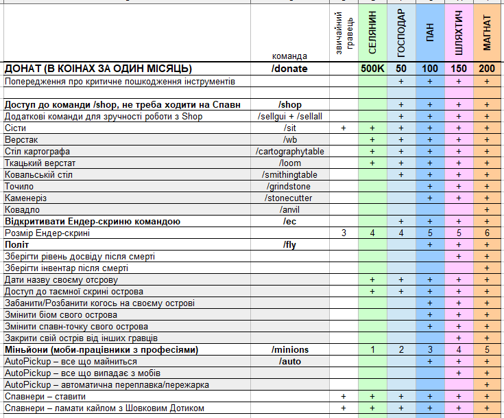 В донат меню /donate Ви можете знайти багато спавнерів, багато яєць спавна та інше.